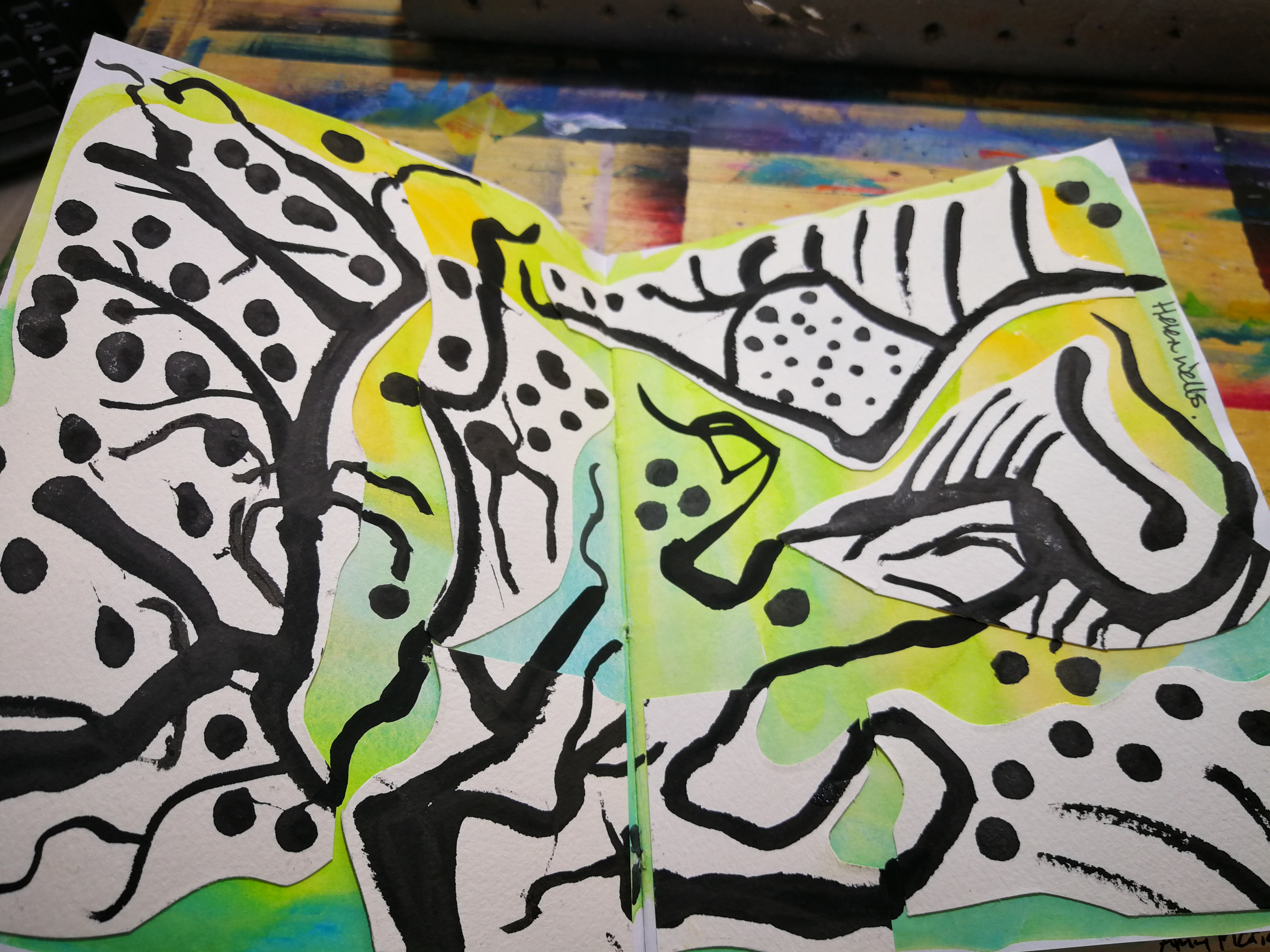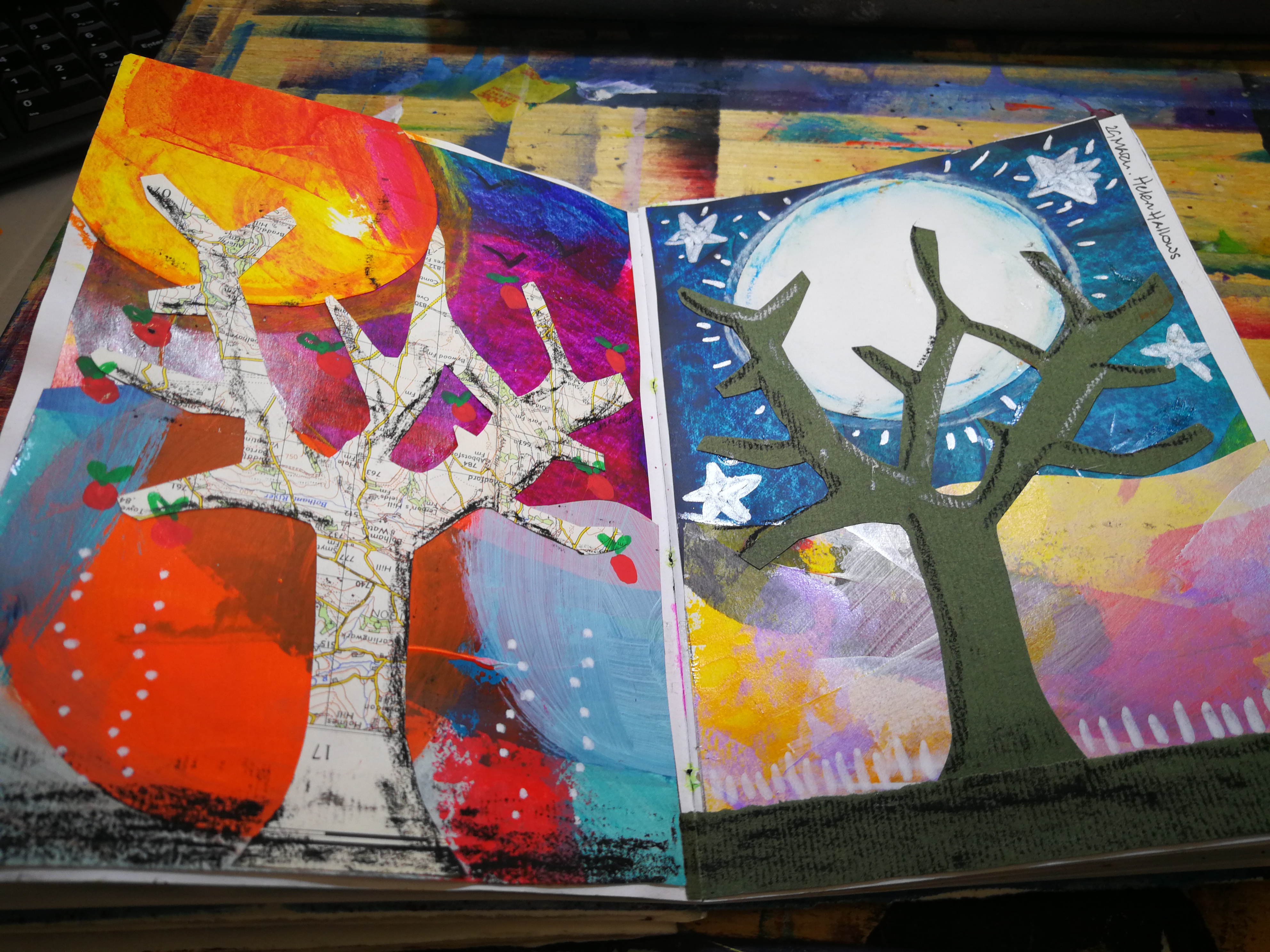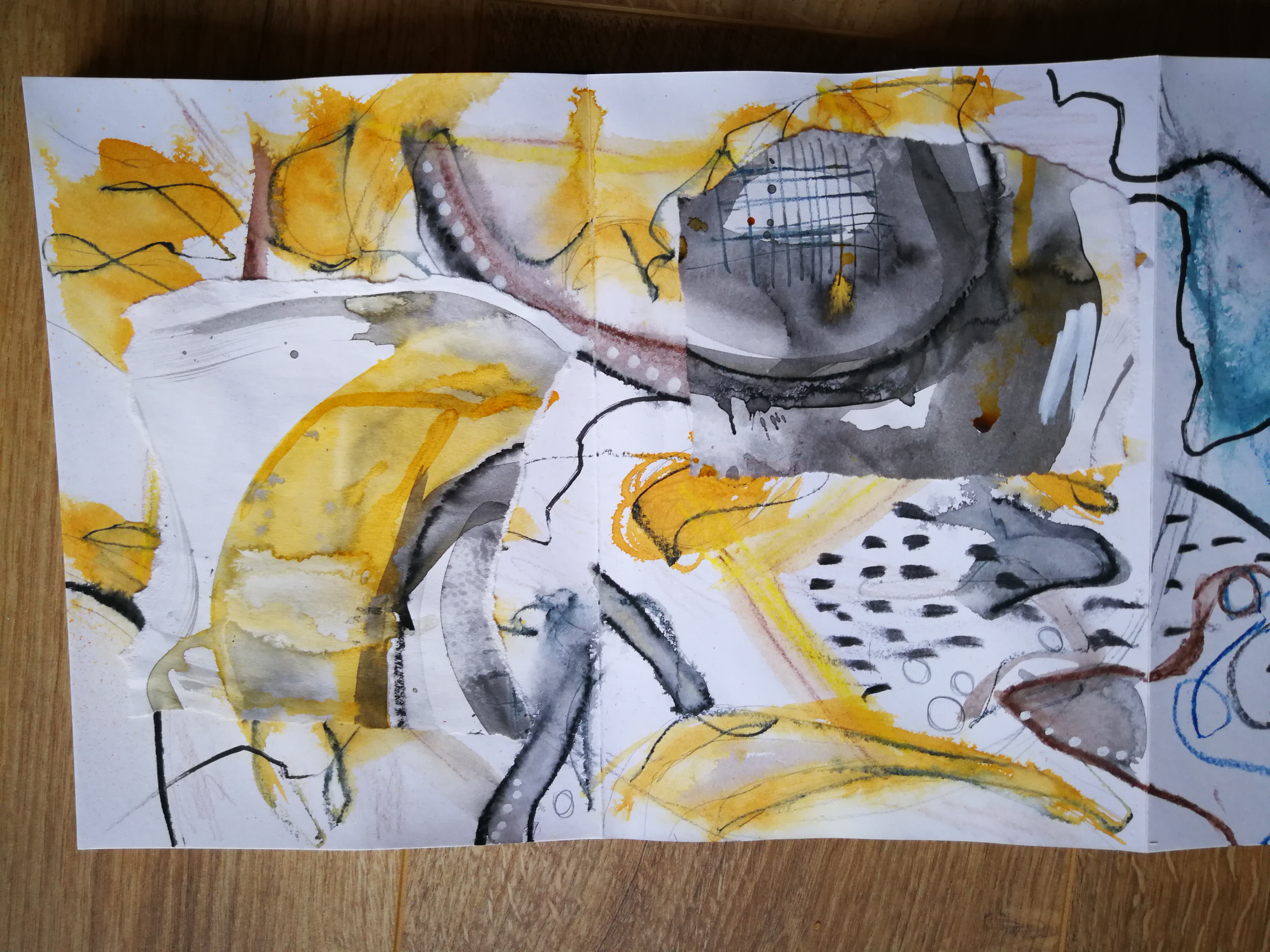 Below are some pictures from the courses I have done. I did a wonderful course from Newlyn School of Art about abstracting the landscape which really got me going and I am currently doing the best yet, a sketchbook course from Karen Stamper. I have had so much fun over the last two weeks and there are four more to go! I have never been so prolific and I can’t wait to see where this ends up. I have learnt so many new techniques and loosened up so much! See some of my concertina sketchbook below!