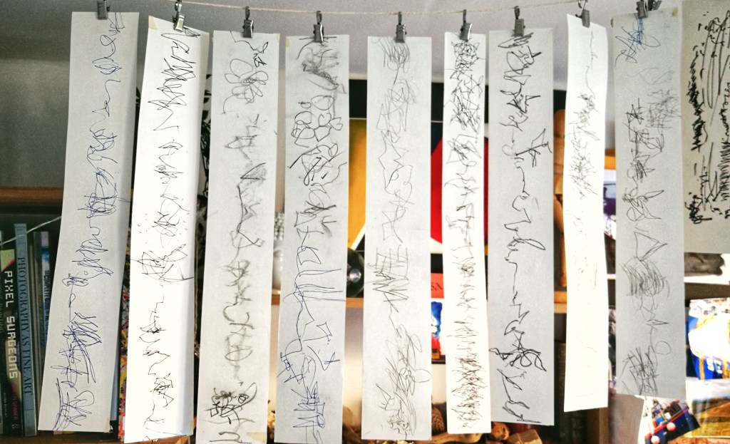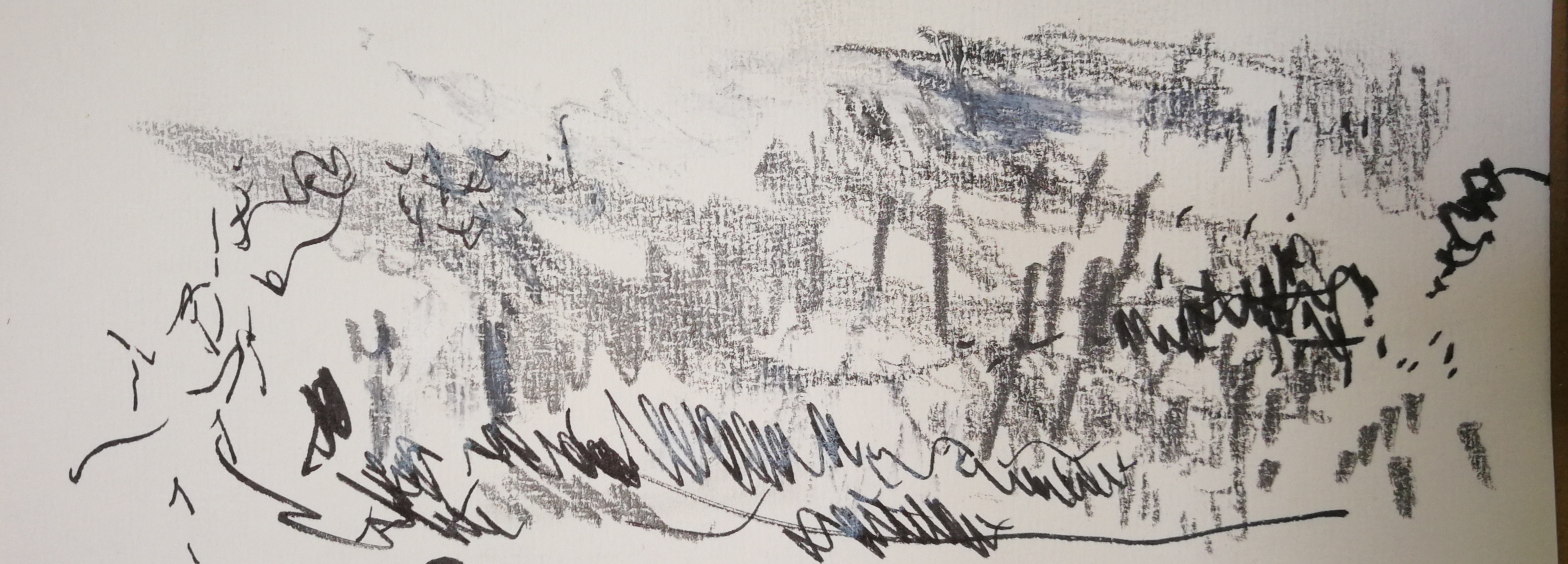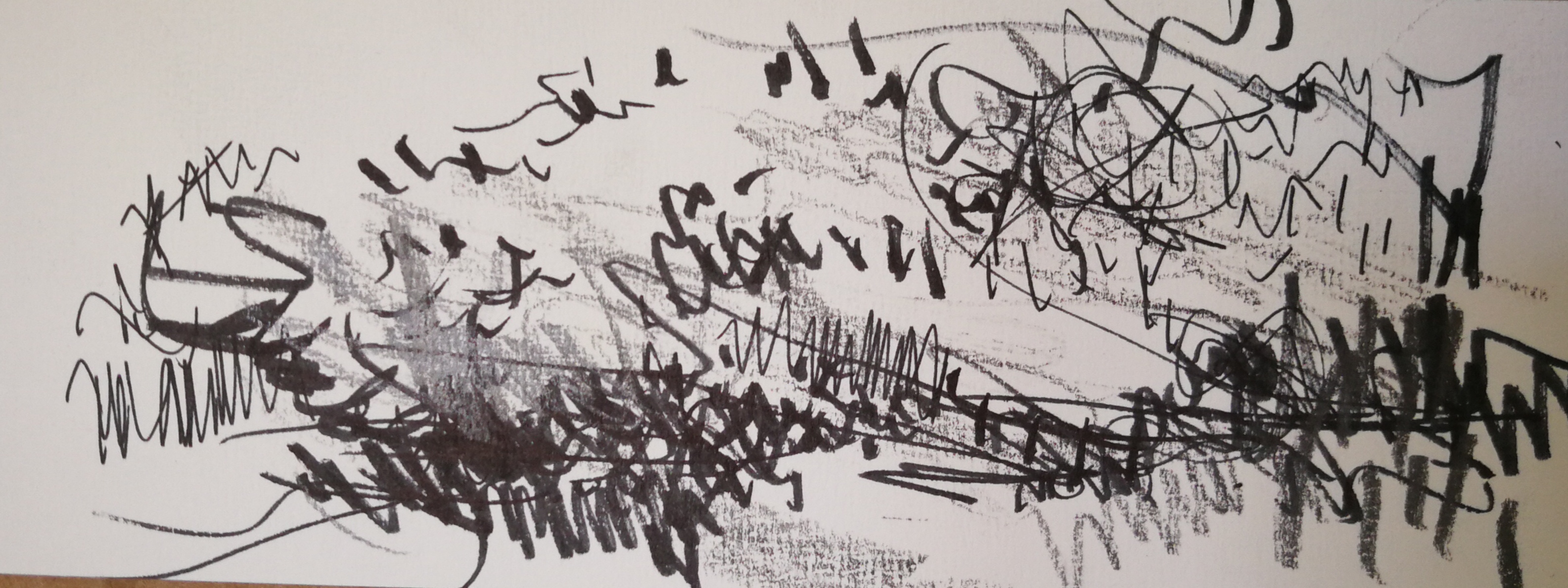 This week I have been thinking about drawing – specifically the need to recreate a visual scene accurately or at least semi accurately. For the past few weeks I have been going to the same spot most days and drawing. But nothing I have drawn would be recognisable as the physical place. However for me they evoke the feeling of the place every bit as much as a quick sketch might. My sound drawings in particular are evocative of every sound, high, low, deep, left, right, short or long. I know what marks represent each sound and I remember hearing it in my place.