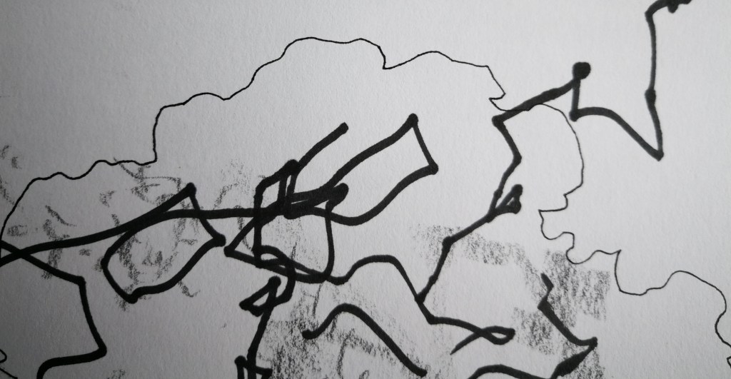 However, it makes sense that in order to quiet the mind and draw instinctively, that incorporating meditation practice would be the obvious step. Katie runs regular meditation and drawing sessions and it was a powerful experience. To spend an hour, with other artists, in silence (except for Katies brief instructions) alternatively meditating, drawing and reflecting was very moving. I found myself drawing sound (as I have incorporated soundscapes into my drawing already), then I started drawing clouds which was fascinating – when was the last time you spent 5 minutes totally focussed on cloud watching? I am not sure I have ever done that! I also drew the wind in the trees outside my studio.