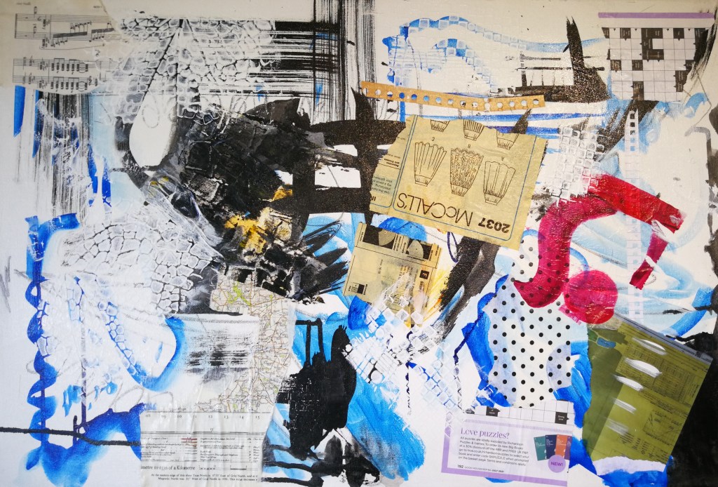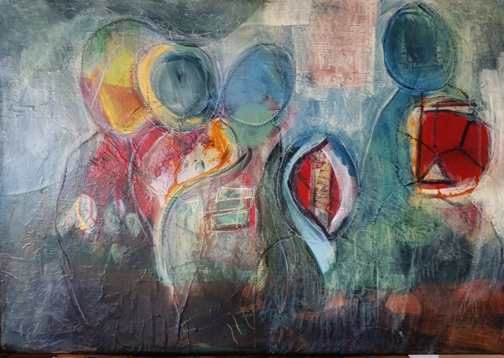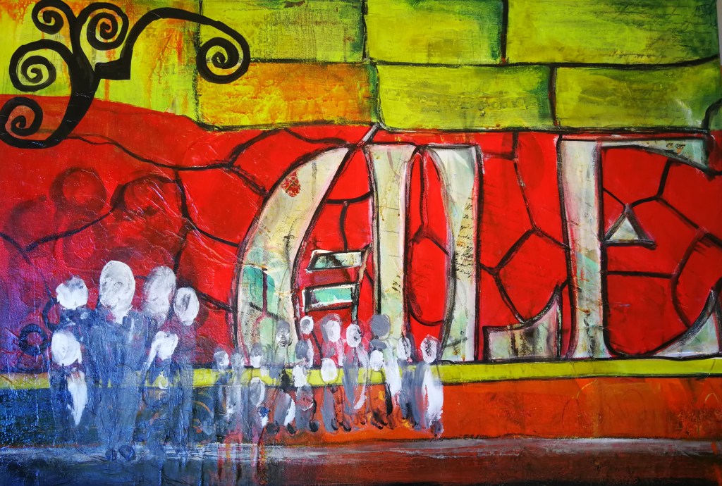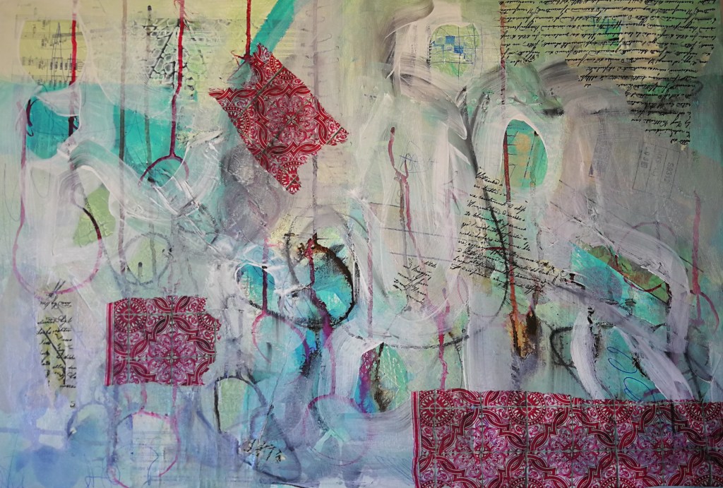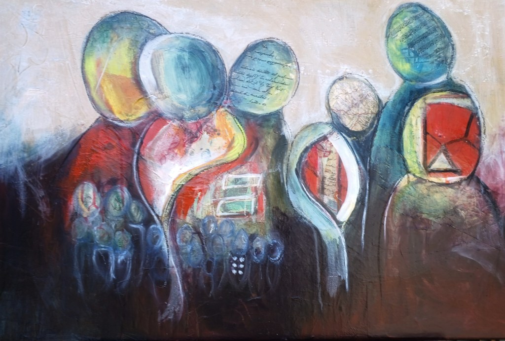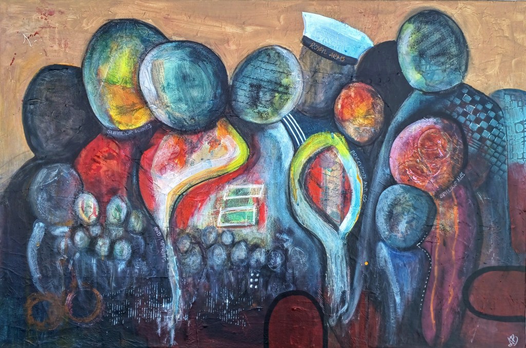 My practice involves adding layers of marks, paint, ink and collage and I added layers of maps and text that meant something about the history of the building.   It was famous as the submariners pub, who would visit after a tour of duty and that went in there.  Slowly the painting came together.    As it developed, using my intuitive approach to painting, a new picture began to emerge.  Figures started appearing (see montage below) and I realised that THIS was the painting that wanted to be created.