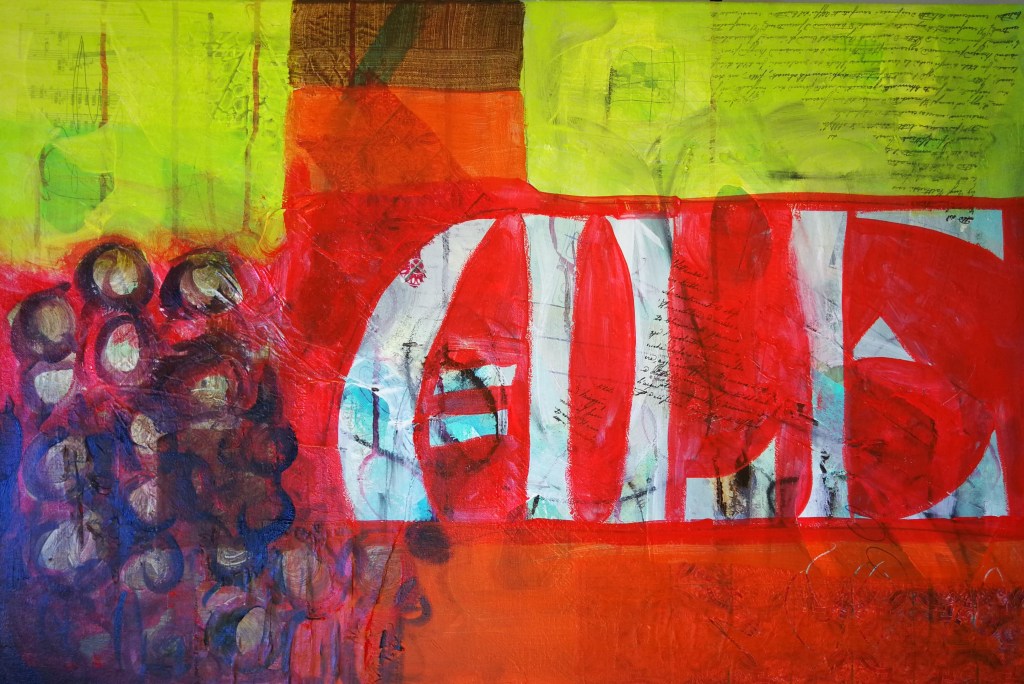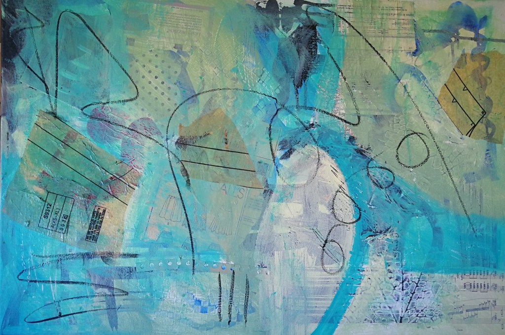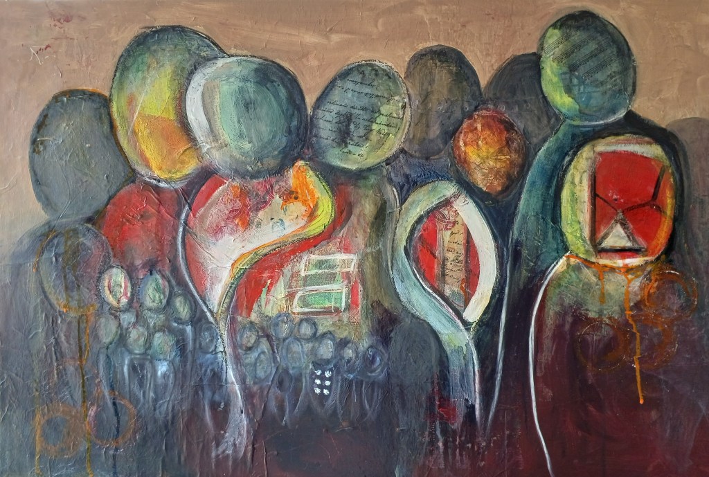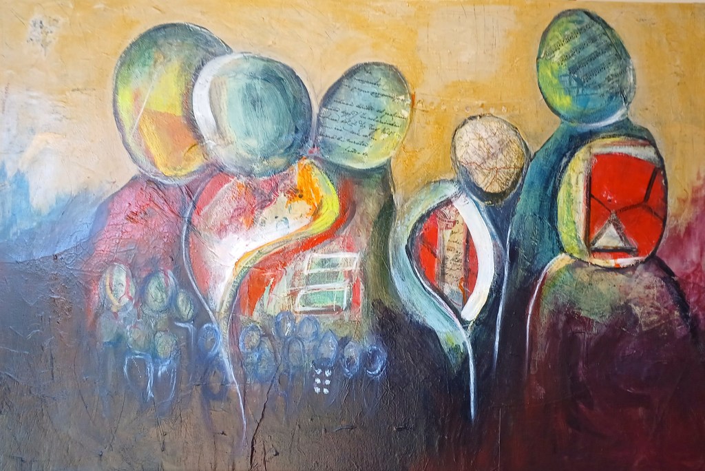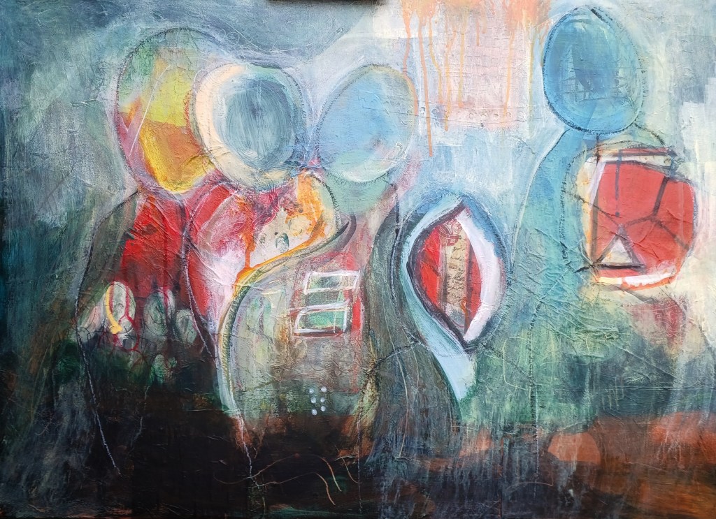 My practice involves adding layers of marks, paint, ink and collage and I added layers of maps and text that meant something about the history of the building.   It was famous as the submariners pub, who would visit after a tour of duty and that went in there.  Slowly the painting came together.    As it developed, using my intuitive approach to painting, a new picture began to emerge.  Figures started appearing (see montage below) and I realised that THIS was the painting that wanted to be created.