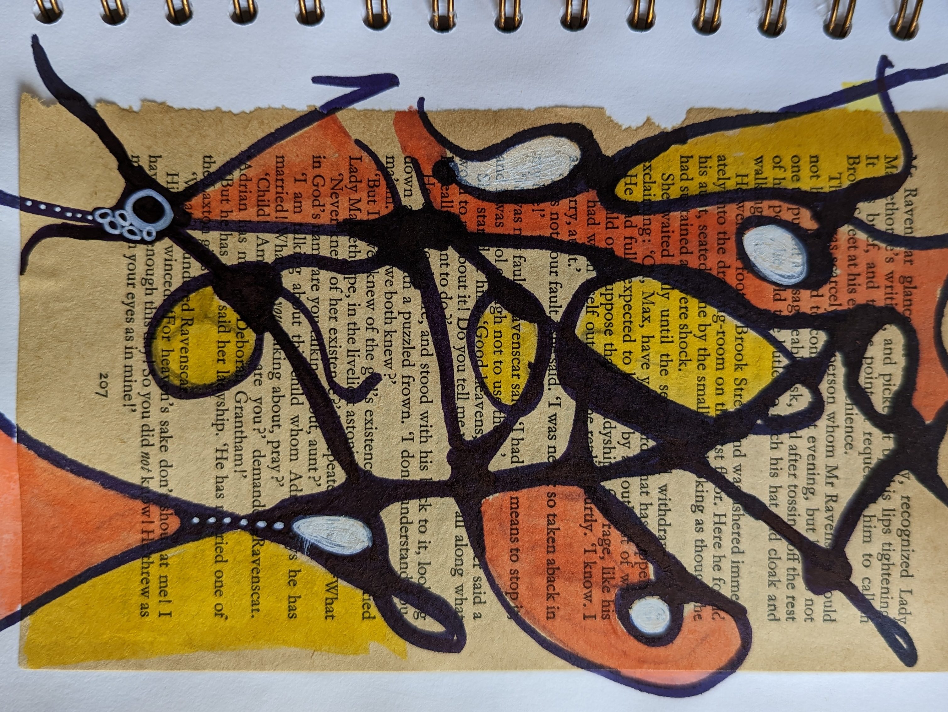 I always take art supplies on holiday but I cannot paint, so I took a watercolour book that I had pre coloured with some ink splashes, watercolour blobs, acrylic paint scrapings… each page was different and I had about a dozen of them. Armed with a black fine point pen and my Poscas, early on I started mindlessly (or is that mindfully or intuitively?) drawing lines, and making connections and I liked what I did (see below). The result was fun, aesthetically pleasing (to me anyway) and most of all calming and theraputic to do.