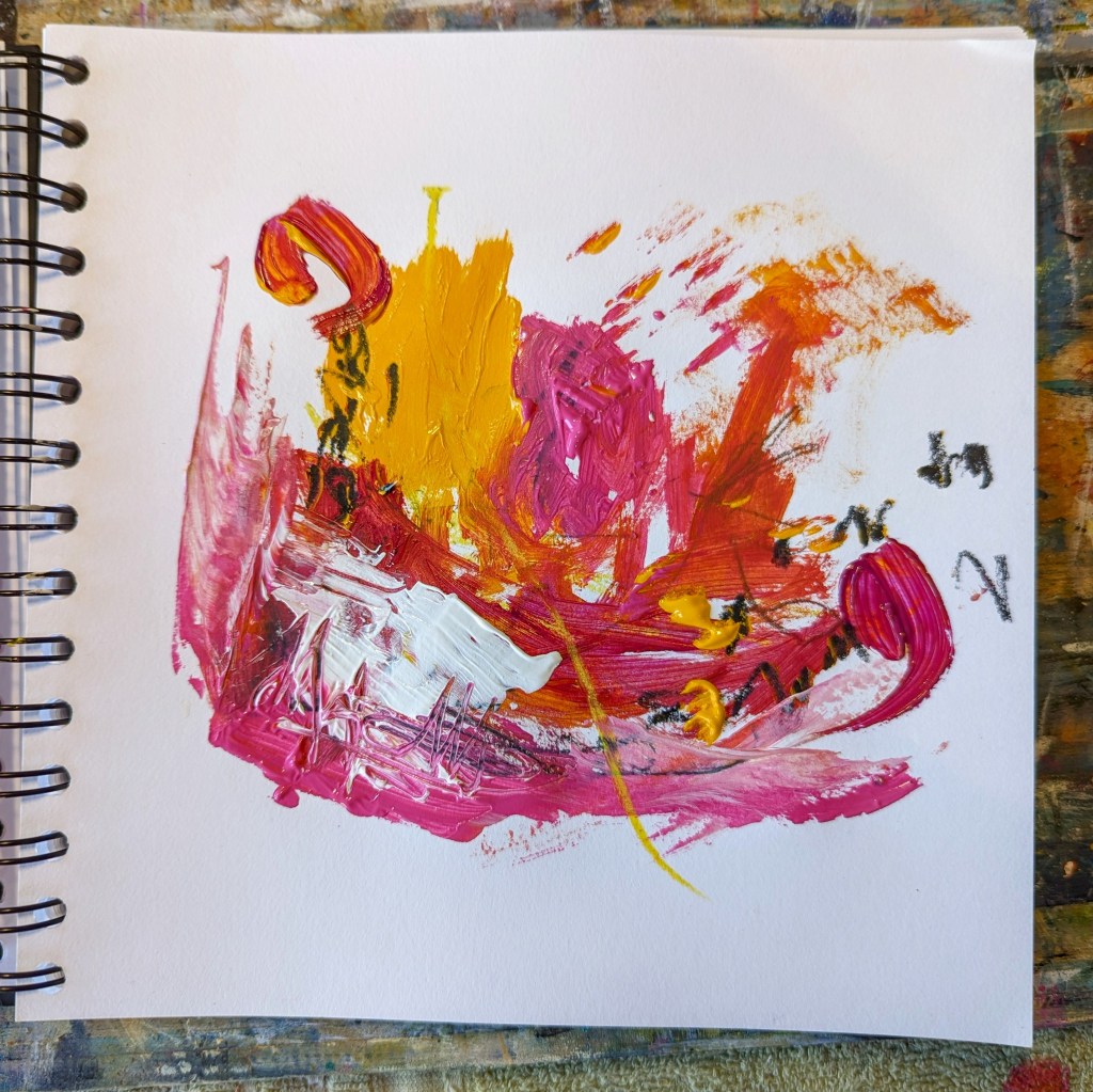 I recently tried painting food, not in the traditional way, but by painting the feelings, taste, texture, smell, temperature etc. The suggestion was to use a fig, which would be an excellent choice, but I only had a steaming hot bowl of chia porridge, which has many textures (soft chia, hard nuts) and flavours (mild flavours together with ginger warmth) and hits of apple and raspberry. There is also a rhythm to eating that translates into marks. My resulting painting is below: