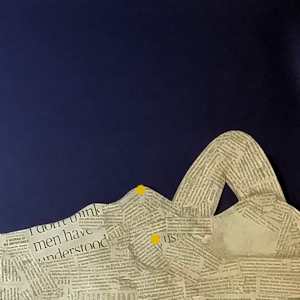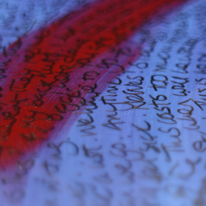 Surrender – 60cm square mixed media and collage on canvas. Framed in deep, white, float frame.