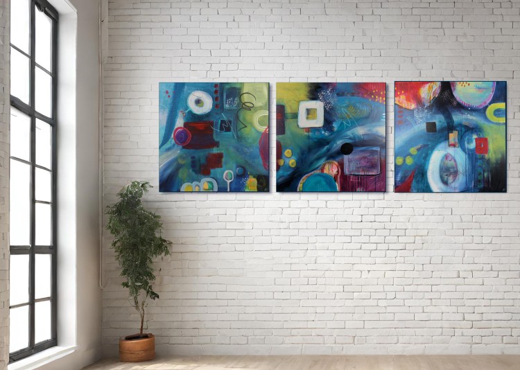Absence – a tryptic of 60cm square canvases. Mixed media.