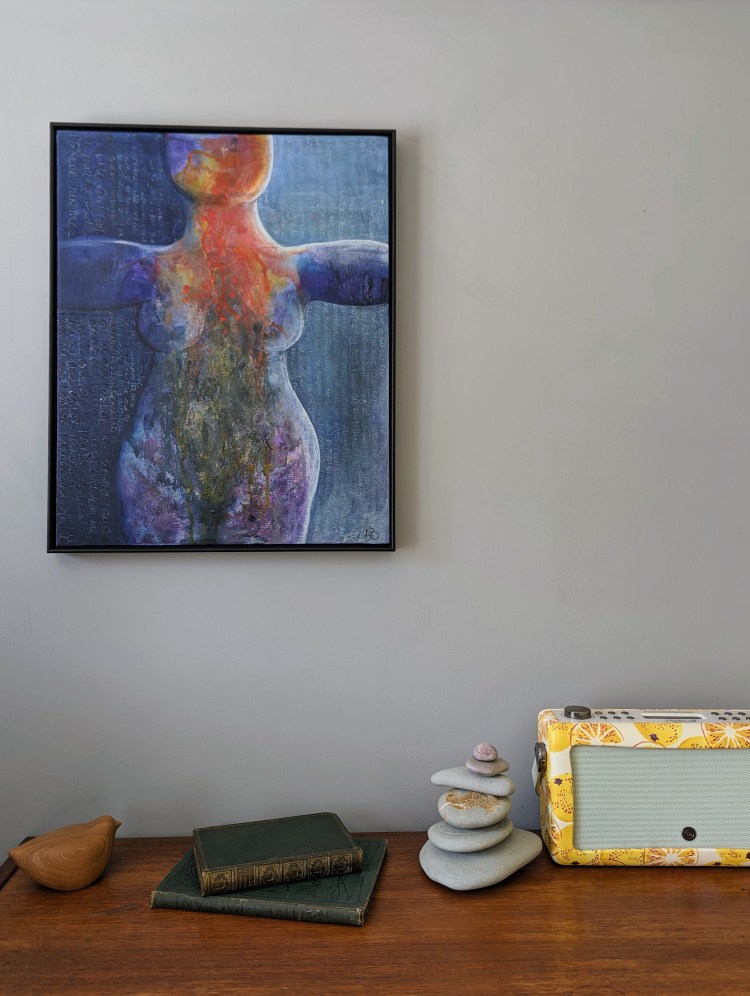 I am woman – mixed media on canvas. Framed in a black float frame.