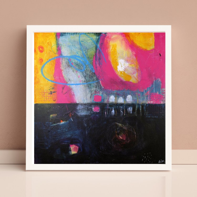 Summer Storm – 60cm square mixed media and collage on canvas. Framed in deep, white, float frame.