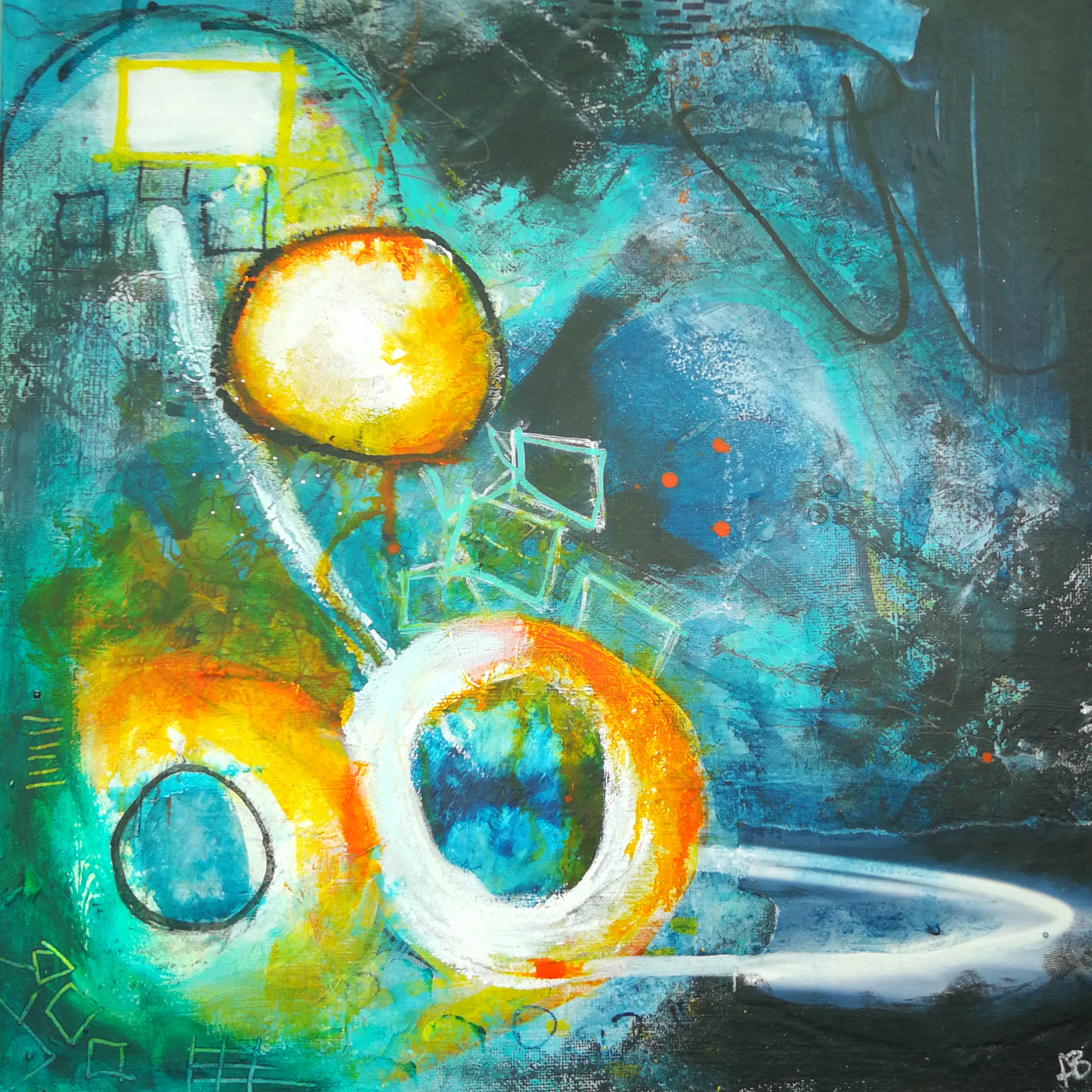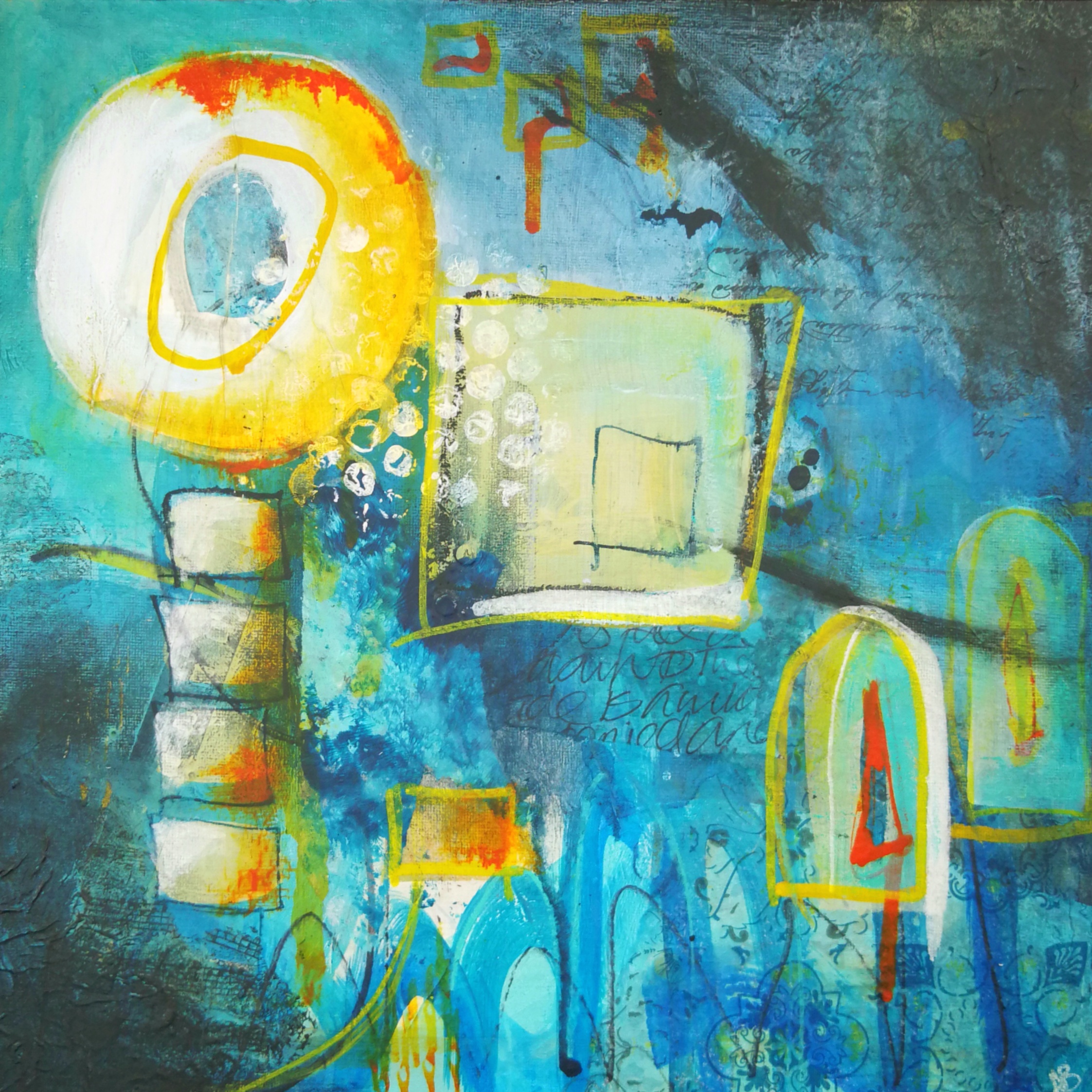 My process is intuitive and driven by fun. I collage papers and use a variety of unusual tools as well as the more usual brushes, nibs and pens as well as my fingers. One painting could comprise acrylic paint, inks, oil pastels, charcoal, graphite, acrylic pens, water-soluble crayons and more.