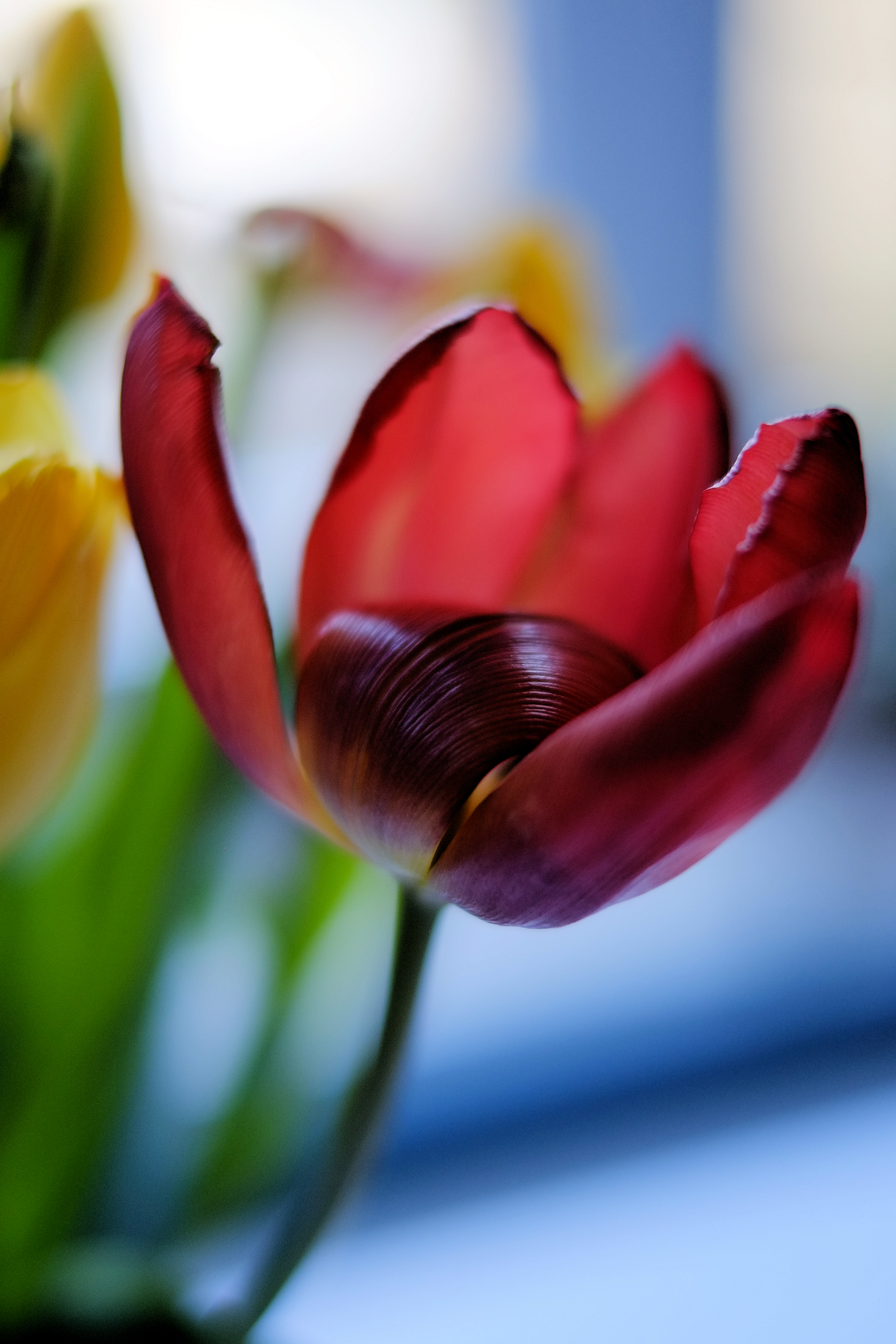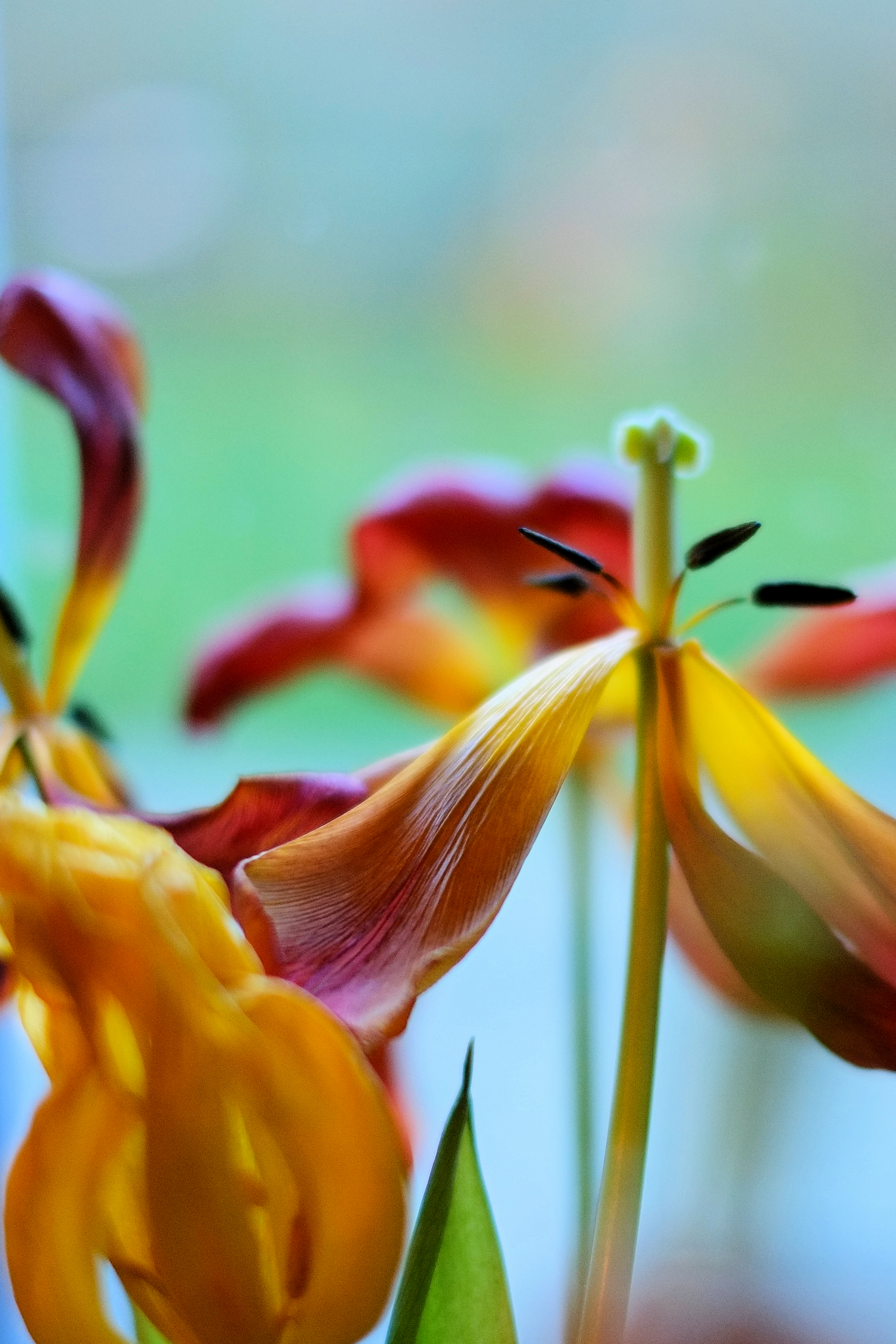 When the tulips are two weeks old and definitely at the end of life, I find them more beautiful than ever before. They have dropped petals to reveal the secrets within, their colours have deepened and become so varied and rich and their stalks, although bent and curved, are far more fascinating than before.