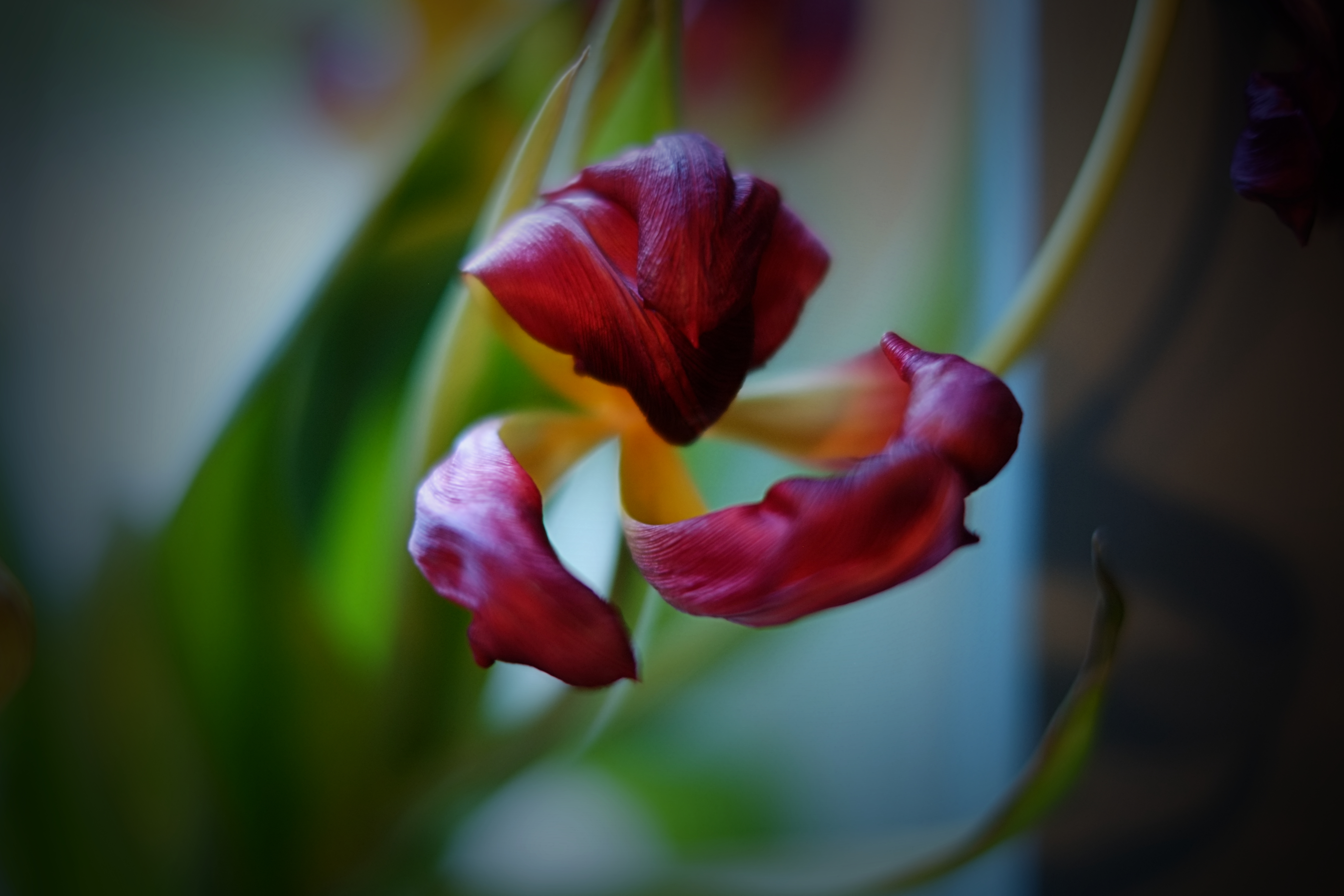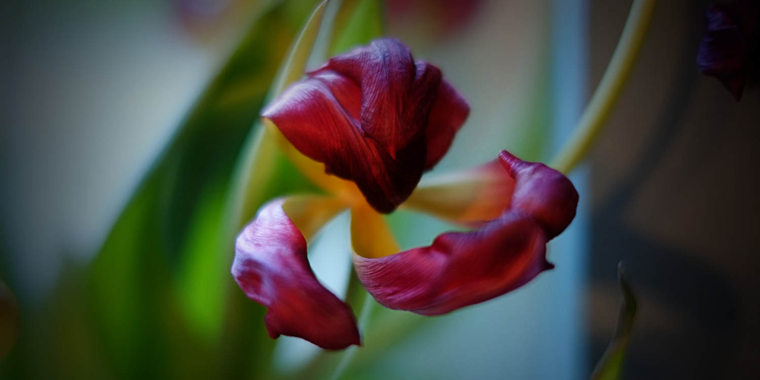 Watching tulips die has taught me a great deal about the beauty of growing older, about how they are far more interesting when they are knarled and bent and glorious in their final days.